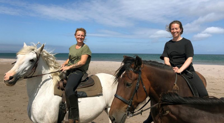 Vor einem Ausritt müssen Justine und Stephy (v.l.n.r.) ihre Pferde erst einfangen. Die Tiere leben im Sommer frei auf der Insel Miquelon-Langlade.