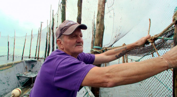 Jeff Foster stellt in der Bay of Fundy ein traditionelles Fischwehr auf, mit Pfosten im Meeresboden. Mit Glück geht ihm hier ein ganzer Schwarm ins Netz.