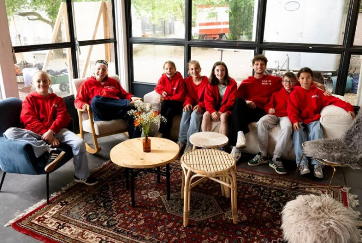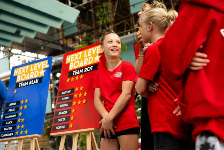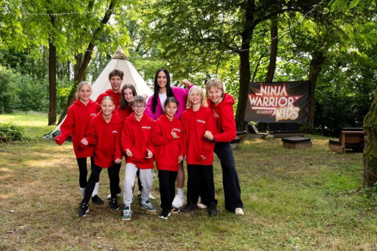 Drehstart für Deutschlands erste Kids-Reality mit Moderatorin Jessica Schöne (ob. Mi.) und prominenten Athlet:innen aus "Ninja Warrior Germany" (Melanie Schmidt, ob. 2.v.li., Ada Theilken, un.re., Lukas Homann, ob.li. und Moritz Hans, un. 3.v.re.)