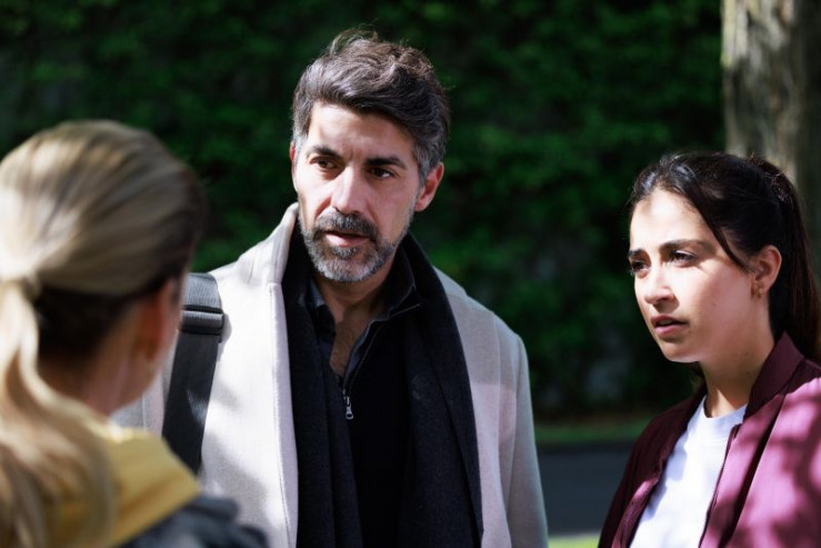 ACHTUNG SPERRFRIST! Die Veröffentlichung dieses Motives ist für alle ONLINE-MEDIEN (außer Programm-Presse) erst ab dem 11.12.2025 frei. Benedikt (Jens Hajek, r.) wird von Jori (Guido Broscheit, hinten l.) in Augenschein genommen. Links Ronja (Theresa Traser), hinten rechts Stella (Bettine Langehein) +++ Die Verwendung des sendungsbezogenen Materials ist nur mit dem Hinweis und Verlinkung auf RTL+ gestattet. +++