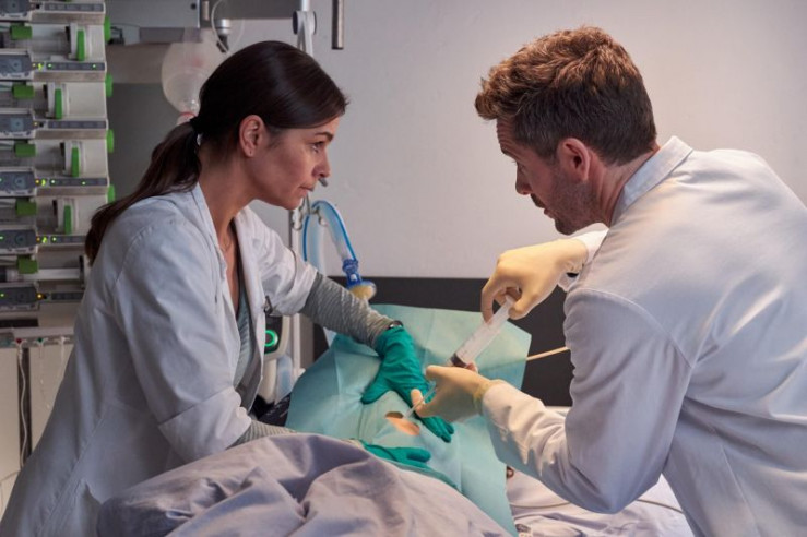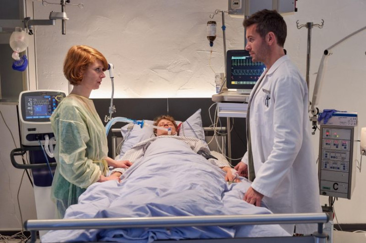 Laura Seifert (Susan Hoecke) und Alex Rode (Jan Hartmann, r.) müssen den Komapatienten David Funken (Ronny Miersch) punktieren.