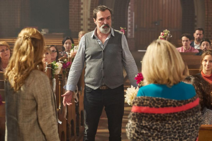 Karins (Jessica Ginkel, l.) Vater Walter (Andreas Hoppe) taucht unerwartet auf der Taufe seiner Enkeltochter Frida auf. Nicht nur Karin, sonder auch ihre Mutter Charlotte (Andrea L`Arronge) ist überrascht.