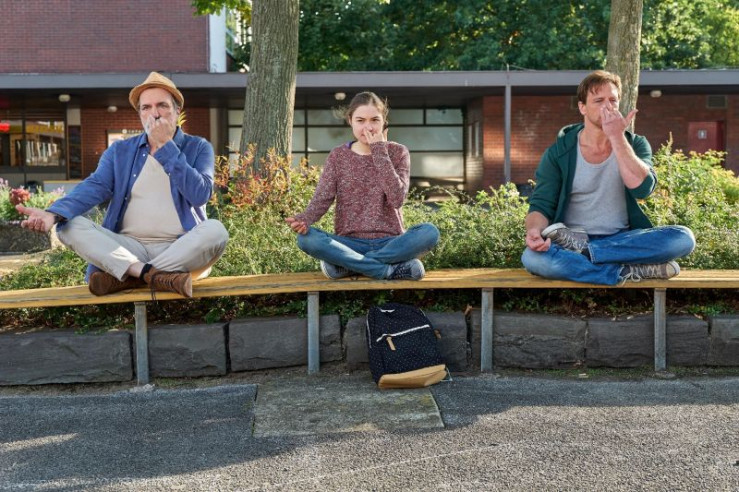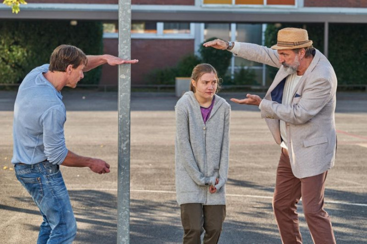 Karins Vater Walter (Andras Hoppe, r.) ist ein erziehungswissenschaftliche Koryphäe und hilft Stefan (Hendrik Duryn) dabei der extrem schüchternen Schülerin Judith (Hannah Schiller) mehr Selbstvertrauen und eine bessere Körperhaltung aufzubauen.