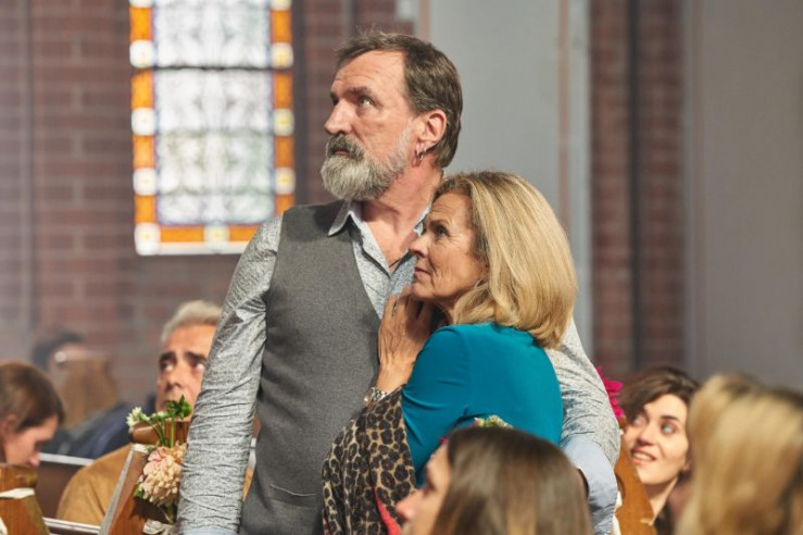 Karins (Jessica Ginkel, l.) Vater Walter (Andreas Hoppe) taucht unerwartet auf der Taufe seiner Enkeltochter Frida auf. Nicht nur Karin, sonder auch ihre Mutter Charlotte (Andrea L`Arronge) ist überrascht.