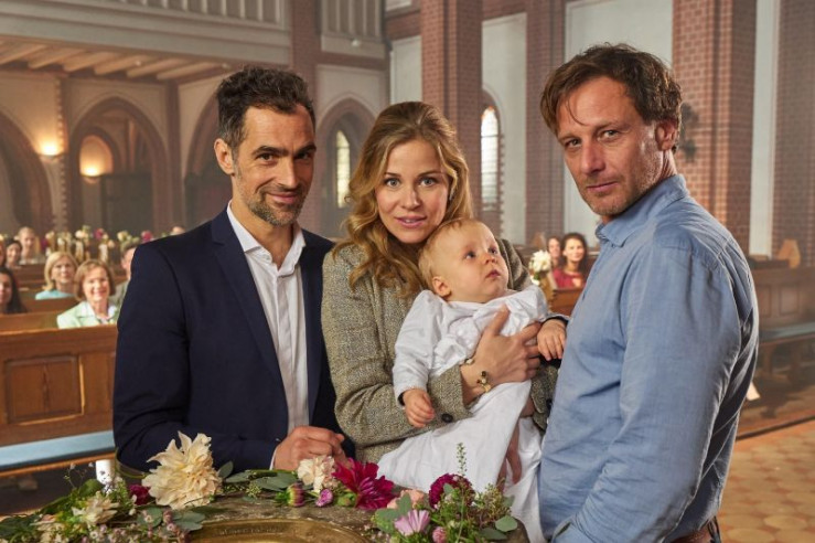 Michael (Gabriel Merz, l.), Karin (Jessica Ginkel) und Stefan (Hendrik Duryn) bei der Taufe von Frida.