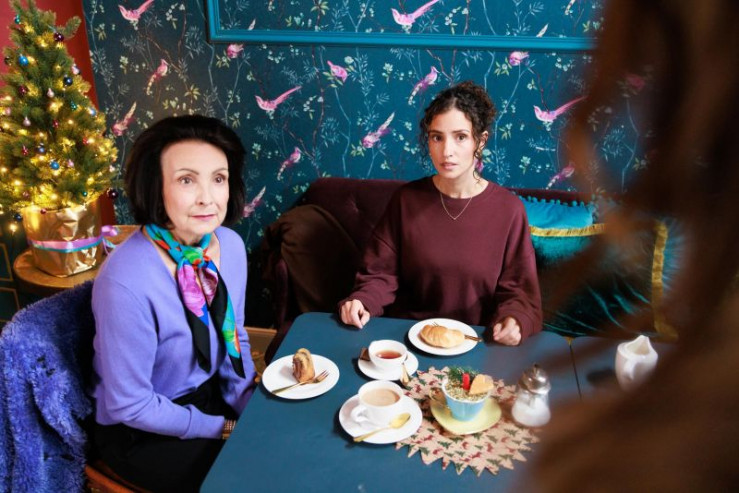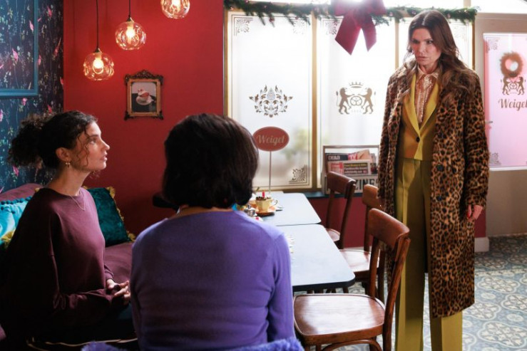 ACHTUNG SPERRFRIST! Die Veröffentlichung dieses Motives ist für alle ONLINE-MEDIEN (außer Programm-Presse) erst ab dem 15.12.2025 frei. Patrizia (Miriam Lahnstein, r.) überrascht die Schillerallee mit einer ehrlichen Geste gegenüber Ute (Isabell Hertel). +++ Die Verwendung des sendungsbezogenen Materials ist nur mit dem Hinweis und Verlinkung auf RTL+ gestattet. +++