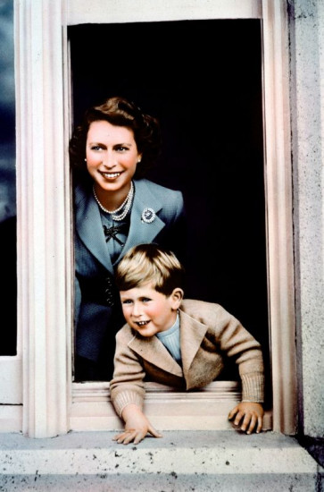 Königin Elizabeth II. mit ihrem dreijährigen Sohn Charles auf Schloss Balmoral im Jahr 1952