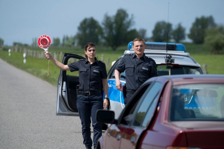 Die Streifenpolizisten Jens Jensen (Florian Lukas) und Süher Özlügül (Sophie Dal) streiten sich bei einer Radarkontrolle.
