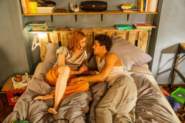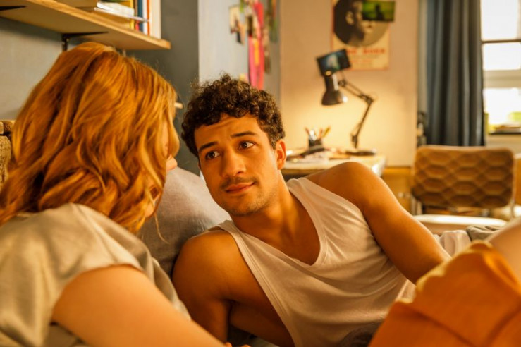 Yannik (Rojan Juan Barani, r.) erklärt Caro (Meriel Hinsching, l.), dass er ein kleines Problem hat und nicht aufstehen kann.