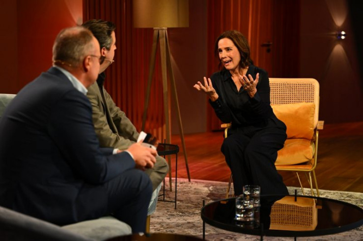 Die mitgebrachten TV-Clips von Gästin Désirée Nosbusch (r.) bringt Oliver Welke (l.) und Bastian (M.) Pastewka zum Lachen.