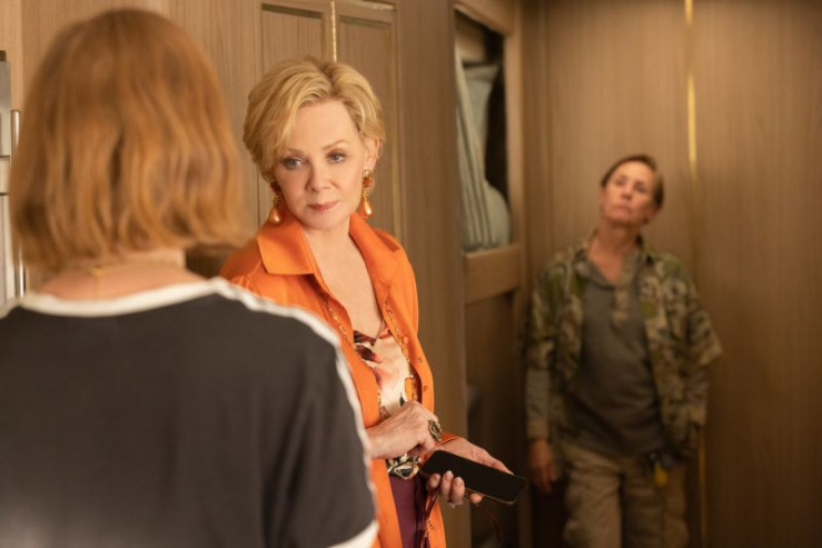 Ava (Hannah Einbinder, l.) erlebt eine herbe Enttäuschung, als sie zusammen mit Deborah (Jean Smart, M.) und Tourmanagerin Weed (Laurie Metcalf, r.) einen ersten Blick in den Tourbus werfen darf.