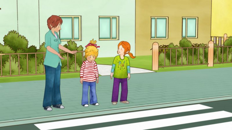 Conni und Anna kennen die Regel: Bei Rot bleibe stehen, bei Grün darfst du gehen. Das Wichtigste beim Überqueren der Straße ist, nach links, rechts, links zu sehen. Nur, wo ist links?