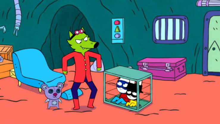 Captain Hase (l.) und Superhase (M.) erfahren von einem Frosch (r.), dass Professor Wolf seine Frosch-Geschwister entführt hat. Eine Mission für die Superhelden!
