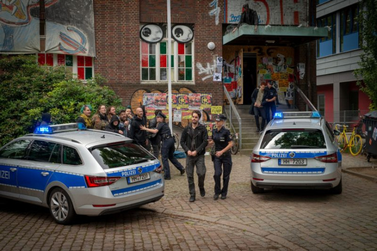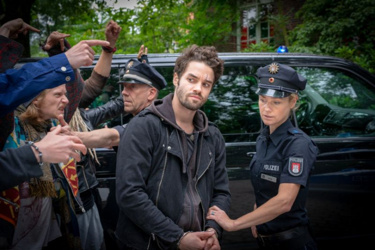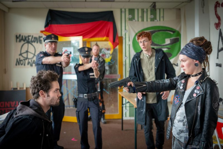 Das linksautonome Zentrum, die Rattenburg, wurde von der Polizei ausgehoben. Hans (Bruno F. Apitz, r.) bringt Ira (Emma Drogunova, l.) zum Streifenwagen.