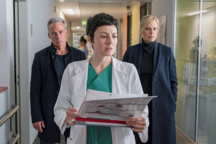 Ina Zimmermann (Melanie Marschke, l.) und Jan Maybach (Marco Girnth, r.) sprechen im Gericht mit Familienrichterin Jennifer Arndt (Rosa Falkenhagen, M.), die über das Sorgerecht für die Kinder des Opfers entschied.