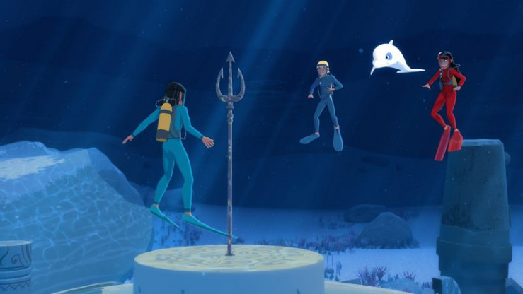 Auru (l.), Yann (2.v.l.), Zoom (2.v.r.) und Timeti (r.) haben unter Wasser eine versunkene Stadt mit allerlei Kunstschätzen entdeckt. Darunter ist auch ein großer Dreizack.