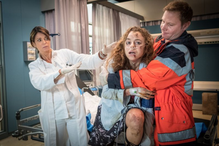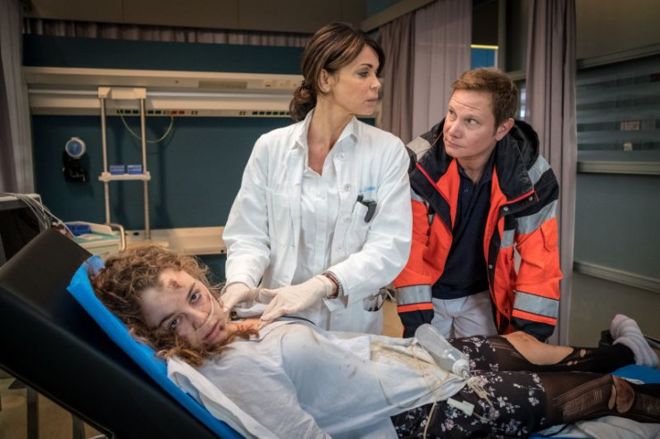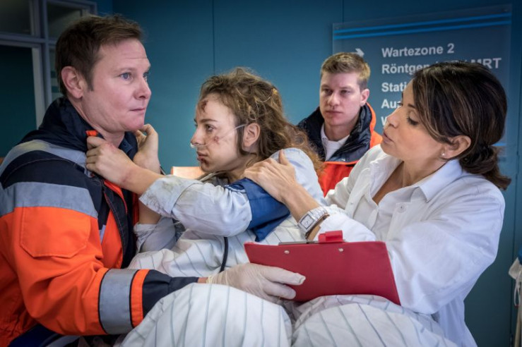 Dr. Haase (Fabian Harloff, r.) und Dr. Jonas (Gerit Kling, M.) kümmern sich um ihre neue Patientin (Amelie Herres, l.), die offensichtlich unter Drogeneinfluss steht.