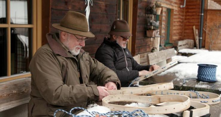 Winter heißt hier heroben etwas anderes als die meisten von uns aus deutlich niedrigeren Lagen kennen. Der Schnee kommt hier schon im Herbst und bleibt lang ins Frühjahr hinein. Rein äußerlich ruht die bäuerliche Arbeit in dieser Zeit, aber natürlich bleiben die Landwirtinnen und Landwirte auch in diesen Monaten aktiv. Die dunklere Jahreszeit steht im Zeichen traditioneller Tätigkeiten wie dem Schindelmachen oder dem Herstellen von Stoffen und Kleidung. Im Bild: Schneeschuh bauen.
