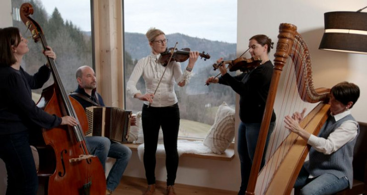 Winter heißt hier heroben etwas anderes als die meisten von uns aus deutlich niedrigeren Lagen kennen. Der Schnee kommt hier schon im Herbst und bleibt lang ins Frühjahr hinein. Rein äußerlich ruht die bäuerliche Arbeit in dieser Zeit, aber natürlich bleiben die Landwirtinnen und Landwirte auch in diesen Monaten aktiv. Die dunklere Jahreszeit steht im Zeichen traditioneller Tätigkeiten wie dem Schindelmachen oder dem Herstellen von Stoffen und Kleidung. Im Bild: St. Peterer Jägerchor.