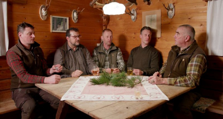 Winter heißt hier heroben etwas anderes als die meisten von uns aus deutlich niedrigeren Lagen kennen. Der Schnee kommt hier schon im Herbst und bleibt lang ins Frühjahr hinein. Rein äußerlich ruht die bäuerliche Arbeit in dieser Zeit, aber natürlich bleiben die Landwirtinnen und Landwirte auch in diesen Monaten aktiv. Die dunklere Jahreszeit steht im Zeichen traditioneller Tätigkeiten wie dem Schindelmachen oder dem Herstellen von Stoffen und Kleidung. Im Bild: St. Peterer Jägerchor.