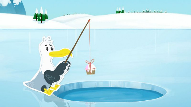 Die Möwe Arnold hat Inui, Grumpel, Hubert und Lissy zum Fischen an einem Eisloch eingeladen.