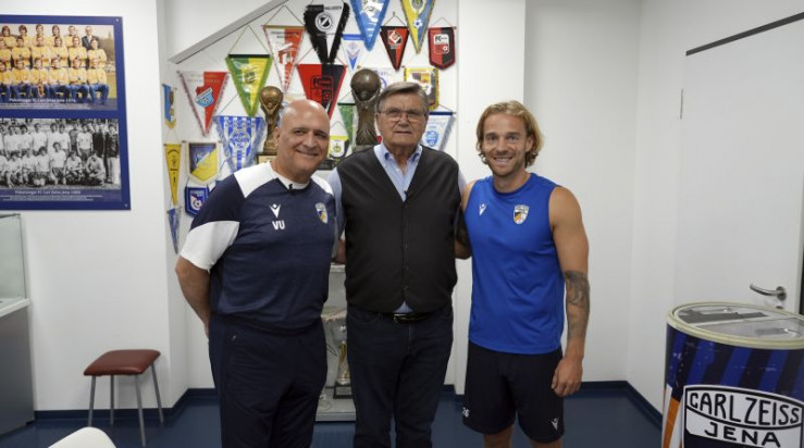 Jena: Ernst-Abbe-Sportfeld: Volkan Uluc (Trainer) + Hans Meyer (Ex-Trainer Carl Zeiss Jena) + Nils Butzen (Kapitän)