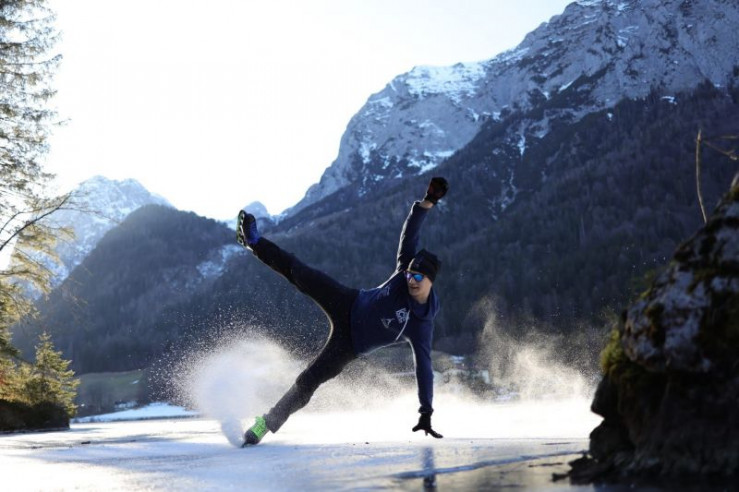In einer Mischung aus Akrobatik und Breakdance gleitet Patrick Brunold über die zugefrorene Eisfläche des Hintersees.