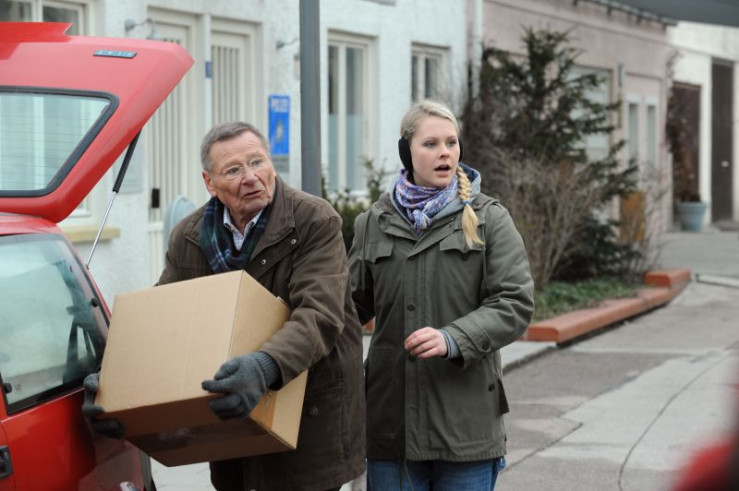 Gregor hilft Uschi, als sie einen Schwächeanfall erleidet. Von links: Gregor Brunner (Holger M. Wilhelm) und Uschi Guggenmoser (Silke Popp).