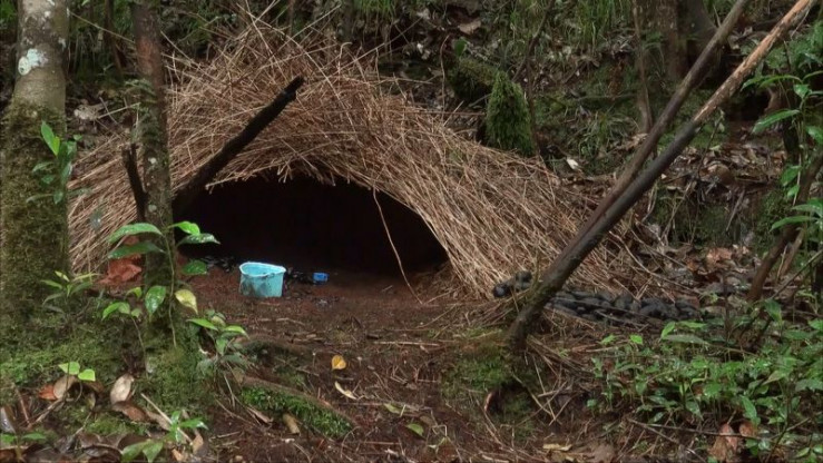 Die Konstruktion eines Hüttengärtner - er gehört zu den Laubenvögeln, an der er rund 3 Monate gearbeitet hat. Zusammen mit der Dekoration, die auch aus Zivilisations-Müll bestehen kann, dient die Laube dazu, Weibchen anzulocken. Die eindrucksvollen Gesängen, die auch aus vielfältigen Imitationen bestehen können, tun ein Übriges, um sich zu präsentieren.