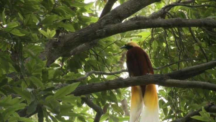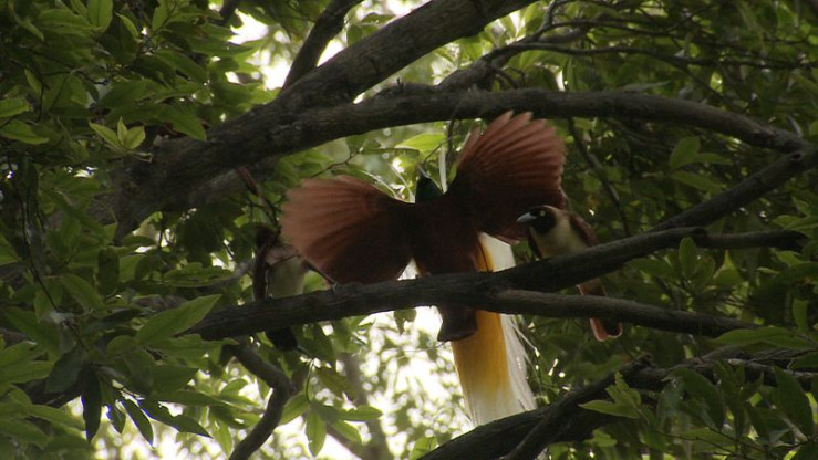 Am Balzplatz des Kleinen Paradiesvogels. Die Weibchen sind äußerlich unscheinbar. Aber sie sind es, die den Vater ihrer Kinder aus einer Gruppe sich präsentierender Männchen aussuchen.