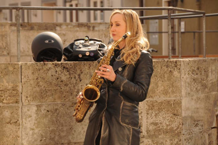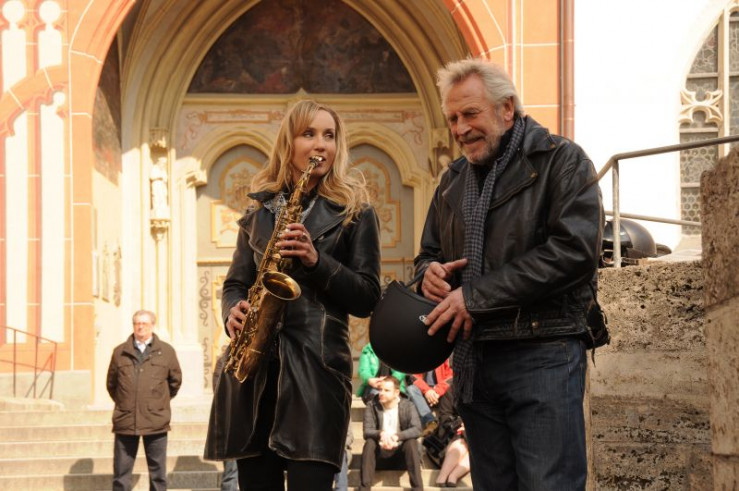 Jana (Isabella Hübner) ergreift kurzerhand die Initiative und spielt mit dem geliehenen Saxophon in der Landsberger Fußgängerzone.