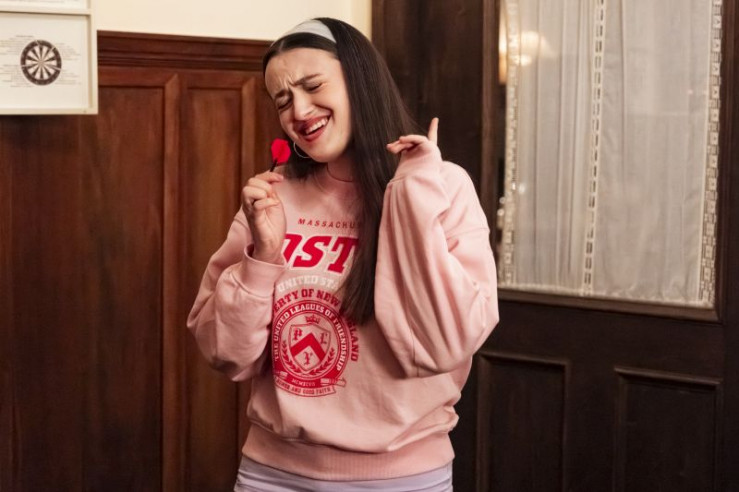 Maja (Godiva Adela) singt während des Dartspielens schräg und wird dabei aufgenommen.