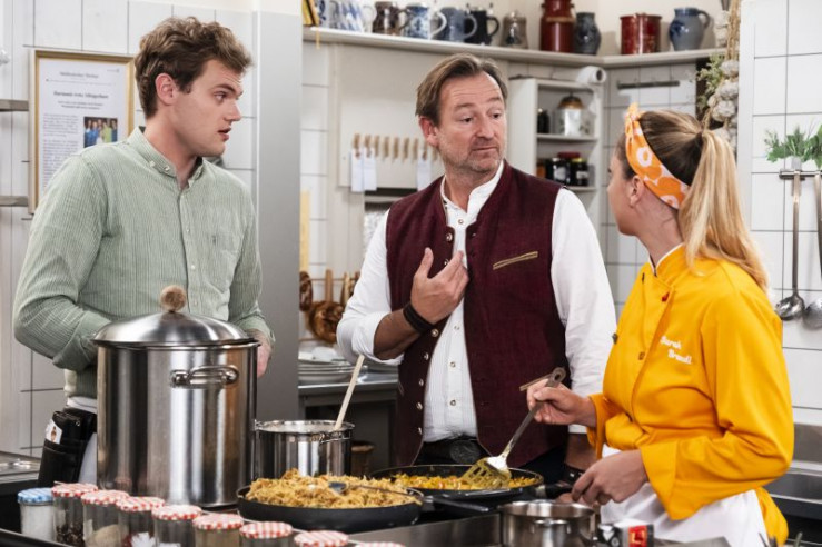 Sarah und Philipp überzeugen Gregor, dass die Reisegruppe zu bewirten nur eine gute Idee sein kann. Von links: Philipp (Philipp Schneider, KLD), Gregor (Holger Matthias Wilhelm), Sarah (Sophie Reiml).