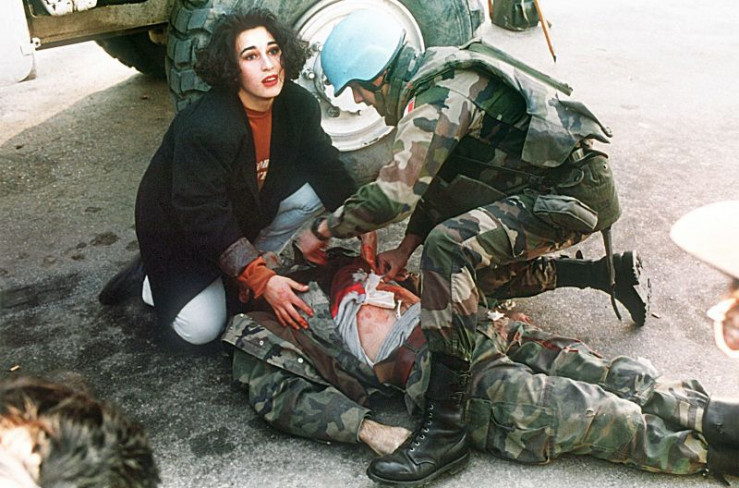 Sarajevo, Bosnien, 1994: Eine Passantin leistet mit einem französischen UN-Soldaten Erste Hilfe, nachdem ein bosnischer Soldat auf offener Straße in Sarajevo angeschossen wurde. Er starb Minuten später.