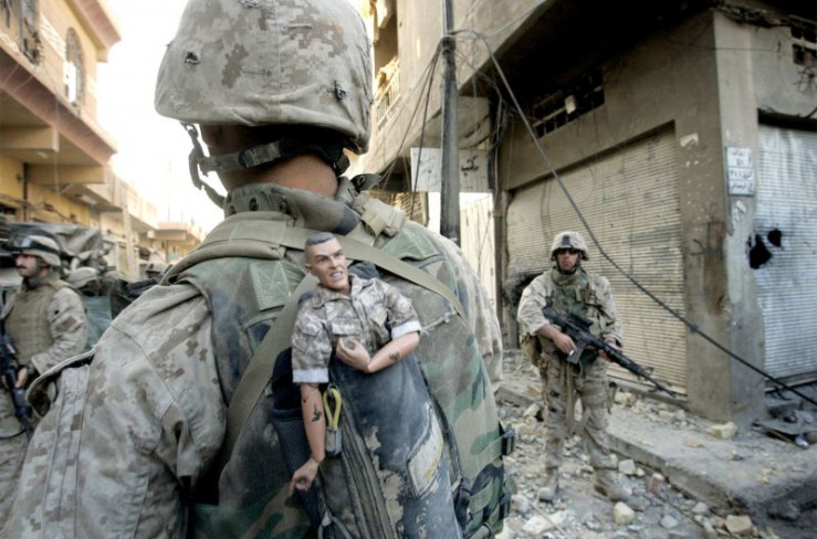 Falludscha, Irak, 2005: Ein irakisches Mädchen hält sich die Ohren zu, als ein Marine der Ersten Division im Zentrum der schwer bewachten Stadt Falludscha patrouilliert.