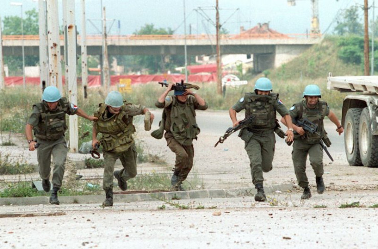 Sarajevo, Bosnien, 1994: Französische und ukrainische UN-Soldaten flüchten, als serbische Scharfschützen das Feuer auf sie in der Innenstadt Sarajevos eröffnen.