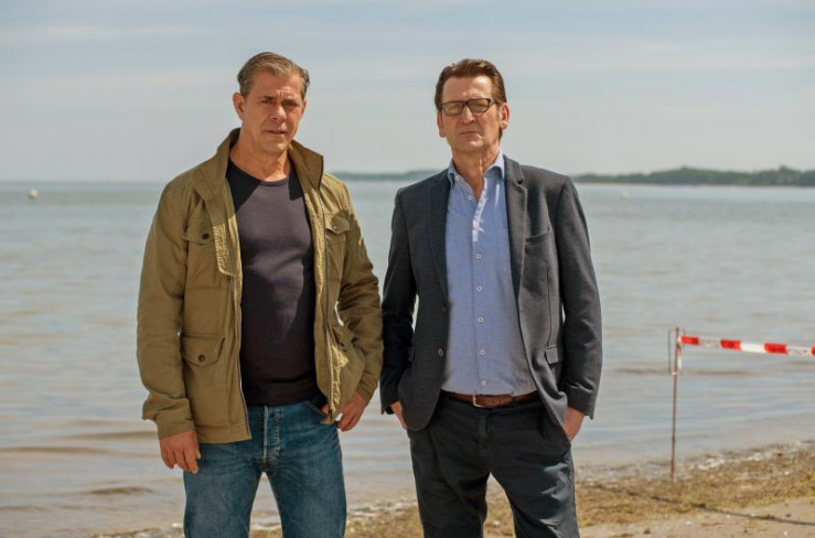 Die Kommissare Finn Kiesewetter (Sven Martinek, l.) und Lars Englen (Ingo Naujoks, r.) am Tatort.