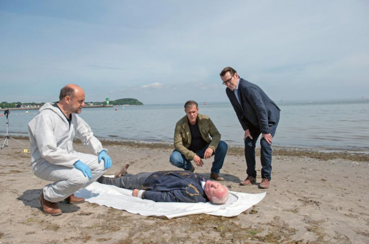 Die Leiche von Frank Loose (Arne Fuhrmann, liegend.) gibt den Kommissaren Finn Kiesewetter (Sven Martinek, 2.v.r.) und Lars Englen (Ingo Naujoks, r.) und Rechtsmediziner Dr. Henning Strahl (Christoph Tomanek, l.) einige Fragen auf.