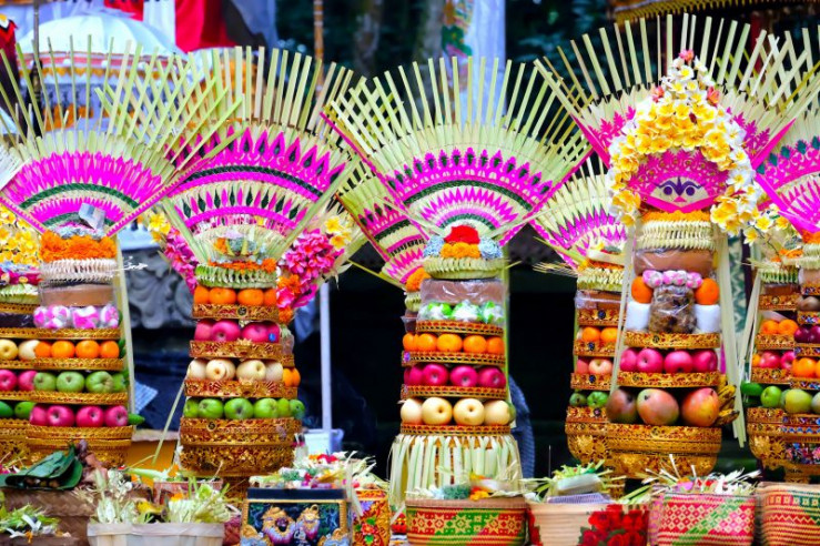 Rituelle Opfergaben für eine hinduistische Zeremonie im Sangeh Tempel auf Bali