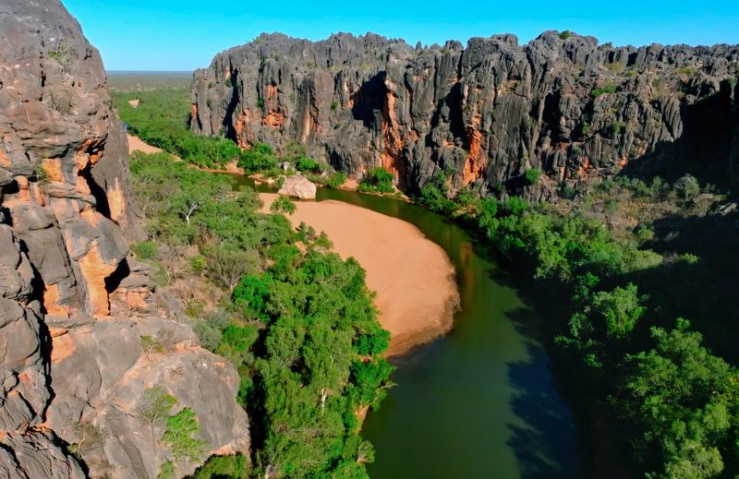Am südlichen Rand der Kimberley-Region ragt ein Korallenriff aus dem Wüstenboden - der Lennard River teilt das kleine Gebirge.