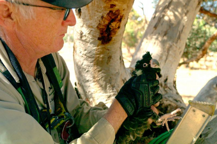 Rick Dawson nimmt den neu geschlüpften Kakadunachwuchs aus dem Bau, vermisst und beringt ihn. Dieses weibliche Küken ist etwa 40 Tage alt.