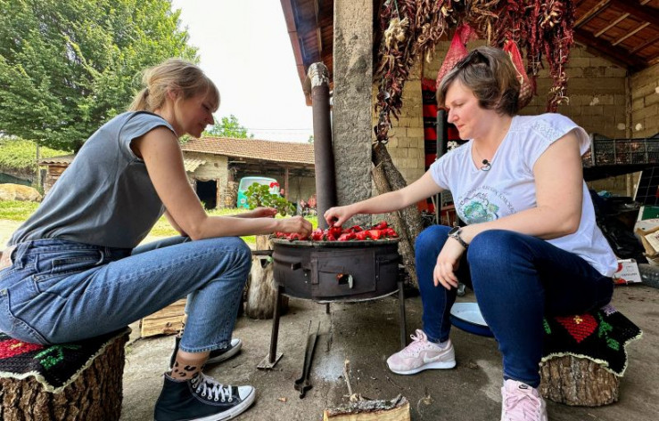 Nina Heins (li.) lernt wie Ajvar hergestellt wird.