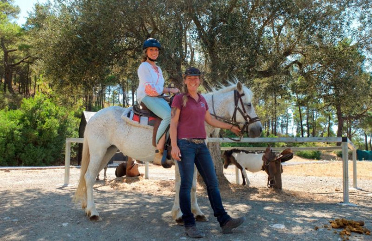 Mit Elpida Hatziioannou-Idé, die eine Ranch im Landesinneren, macht Tamina Kallert (l) einen Reitausflug zu einem traditionellen griechisch-orthodoxen Kloster.