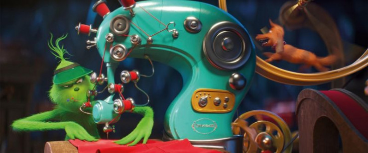 Der Grinch näht mit Hilfe seines Hundes Max sein falsches Weihnachtsmannkostüm.