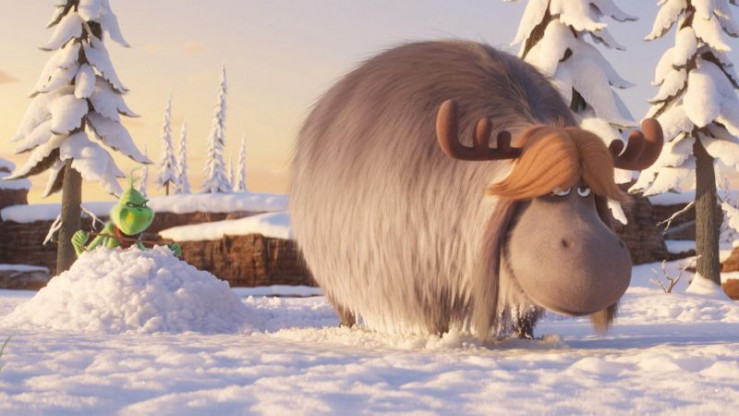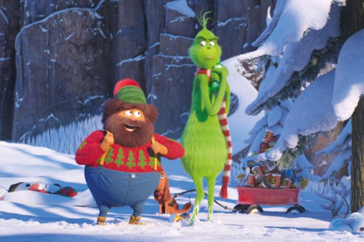 Der fröhliche Nachbar des Grinch, Bricklebaum (l.), teilt dem Grinch und seinem Hund Max mit, dass Weihnachten in Whoville dieses Jahr dreimal so groß sein wird.