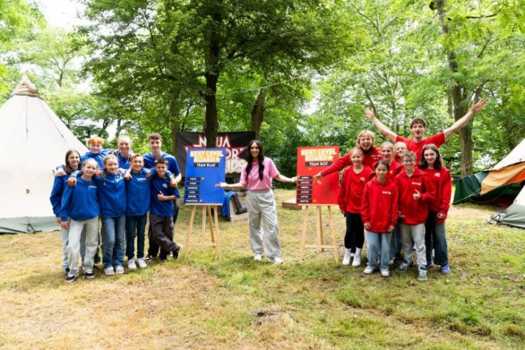 Drehstart für Deutschlands erste Kids-Reality mit Moderatorin Jessica Schöne (ob. Mi.) und prominenten Athlet:innen aus "Ninja Warrior Germany" (Melanie Schmidt, ob. 2.v.li., Ada Theilken, un.re., Lukas Homann, ob.li. und Moritz Hans, un. 3.v.re.)