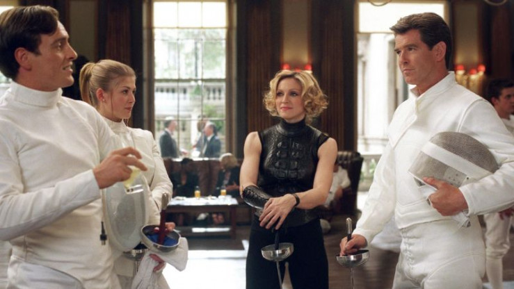 Nach dem Fechtkampf herrscht friedliche Eintracht bei (v.l.) Gustav Graves (Toby Stephens), Miranda Frost (Rosamund Pike), Verity (Madonna) und James Bond (Pierce Brosnan).