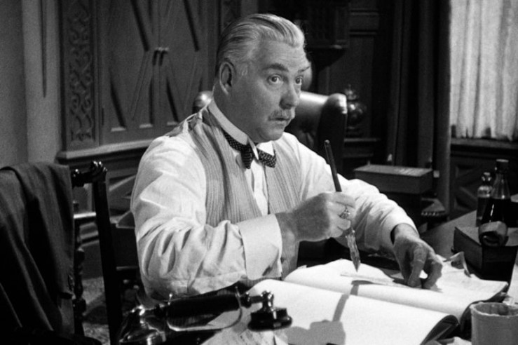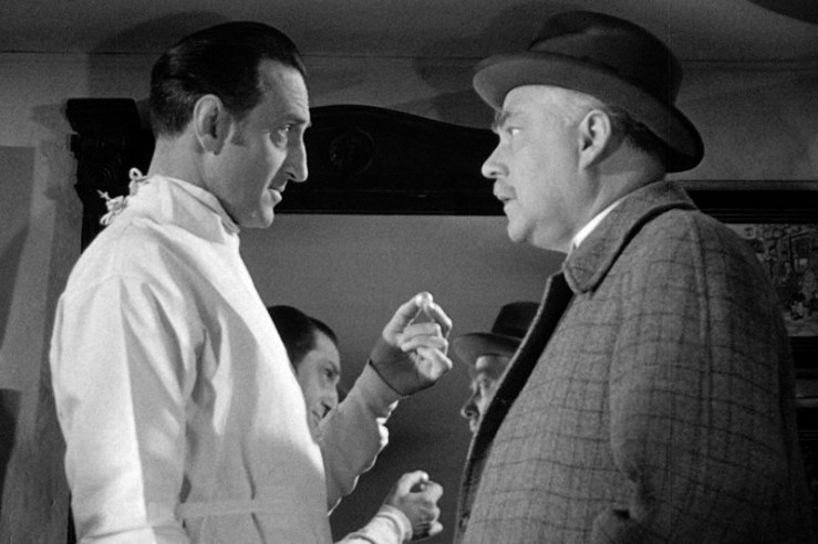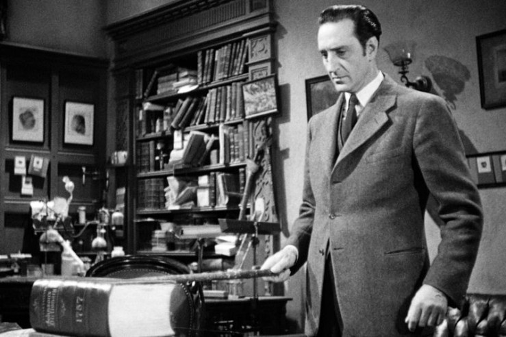 Dr. Watson (Nigel Bruce, l.), Sherlock Holmes (Basil Rathbone, M.), Harry Cording (George Geldner)