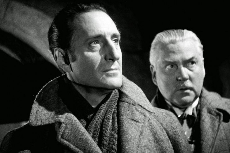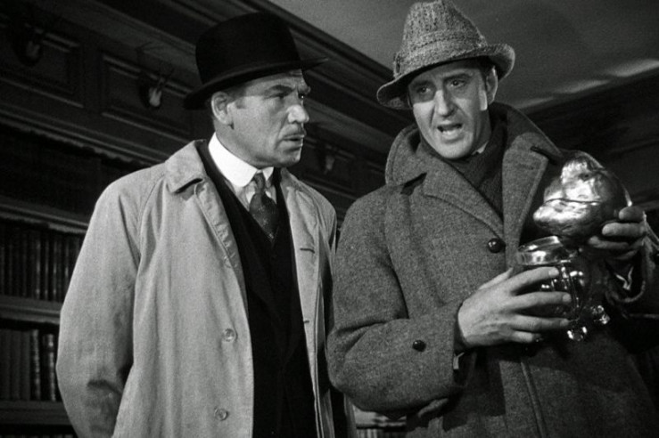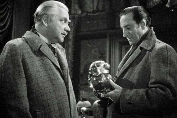 Lestrade (Dennis Hoey, l.) und Sherlock Holmes (Basil Rathbone)