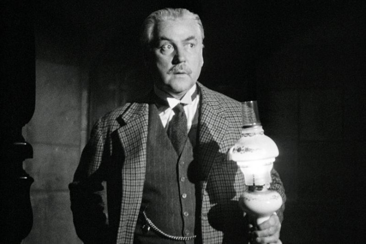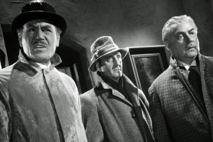 Von links: Lestrade (Dennis Hoey), Sherlock Holmes (Basil Rathbone) und Doctor Watson (Nigel Bruce)